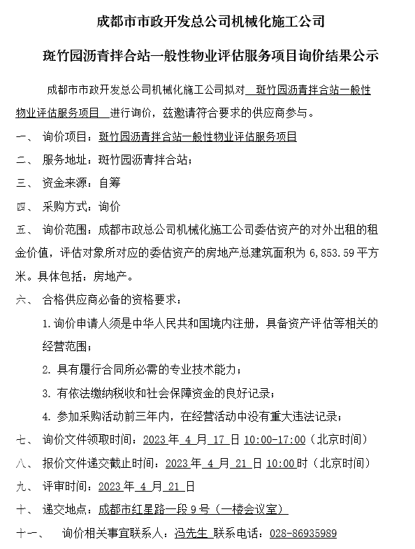 成都市市政开发总公司机械化施工公司斑竹园沥青拌合站一般性物业评估服务项目询价结果公示