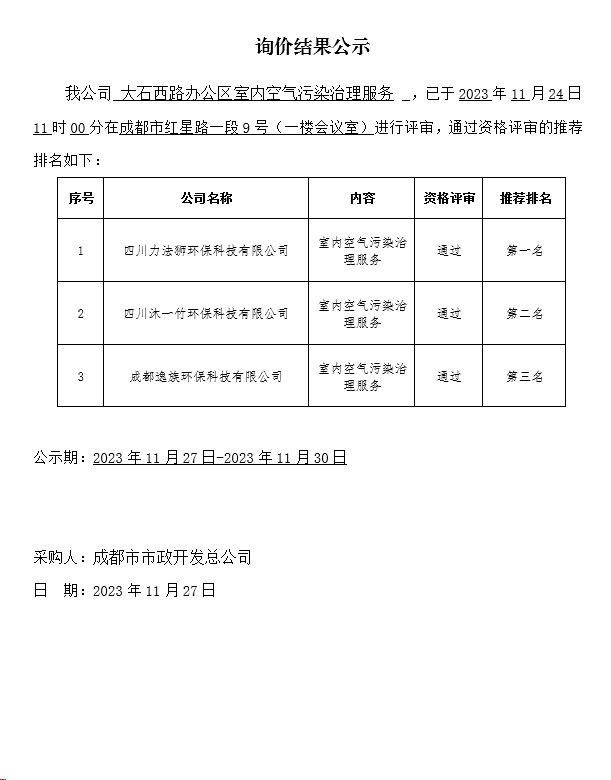 成都市市政开发总公司大石西路办公区室内空起污染治理服务结果公示