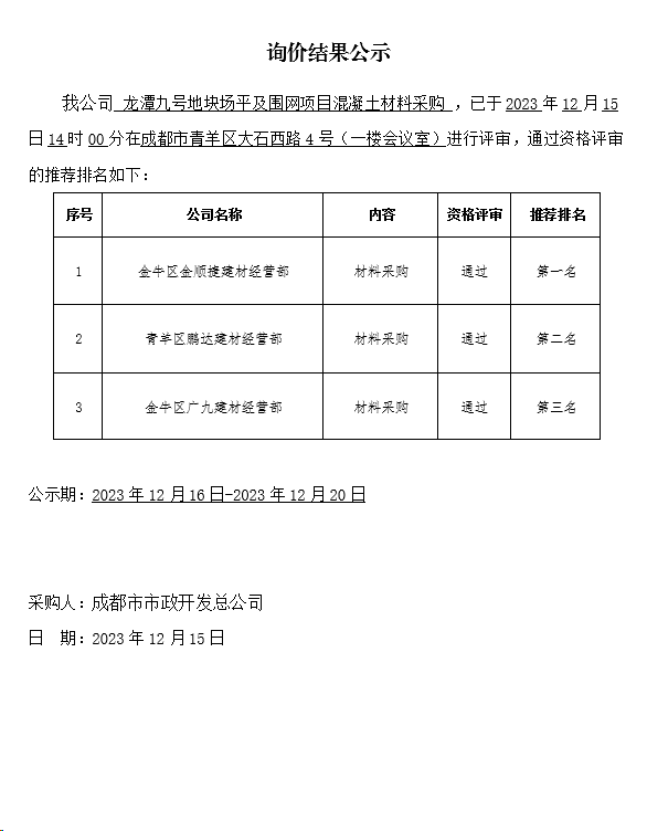 成都市市政开发总公司龙潭九号地块场平及围网项目混凝土材料采购询价结果公示