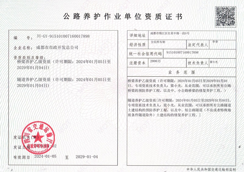 近日,经四川省市场监督管理局批准,建设集团所属成都市市政开发总公司顺利取得“承压类特种设备安装、修理、改造”许可项目中的“公用管道安装(GB1)”资质;经四川省交通运输厅批准,市政公司顺利取得“桥梁、隧道养护乙级资质”。