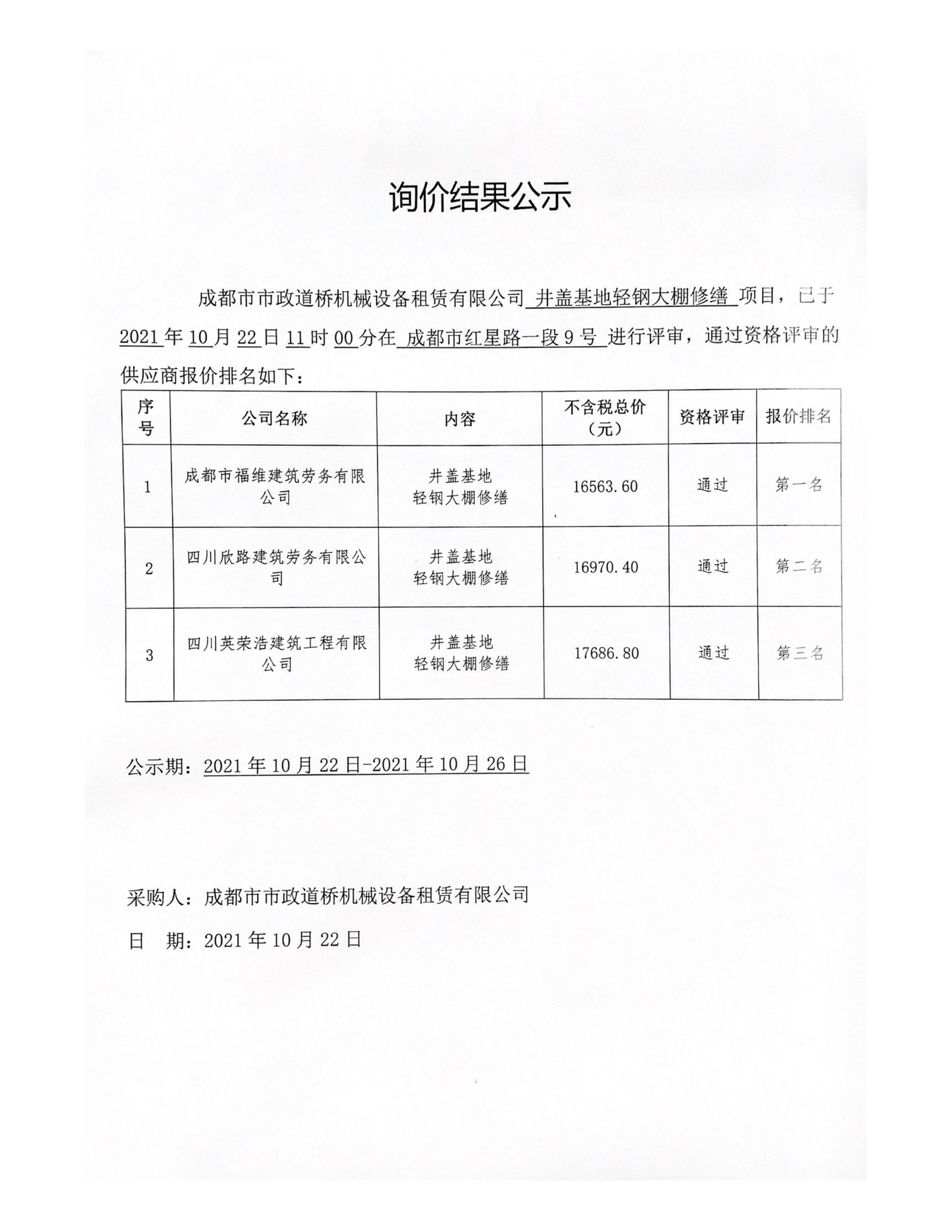 成都市市政道桥机械设备租赁有限公司井盖基地轻钢大棚修缮项目询价结果公示